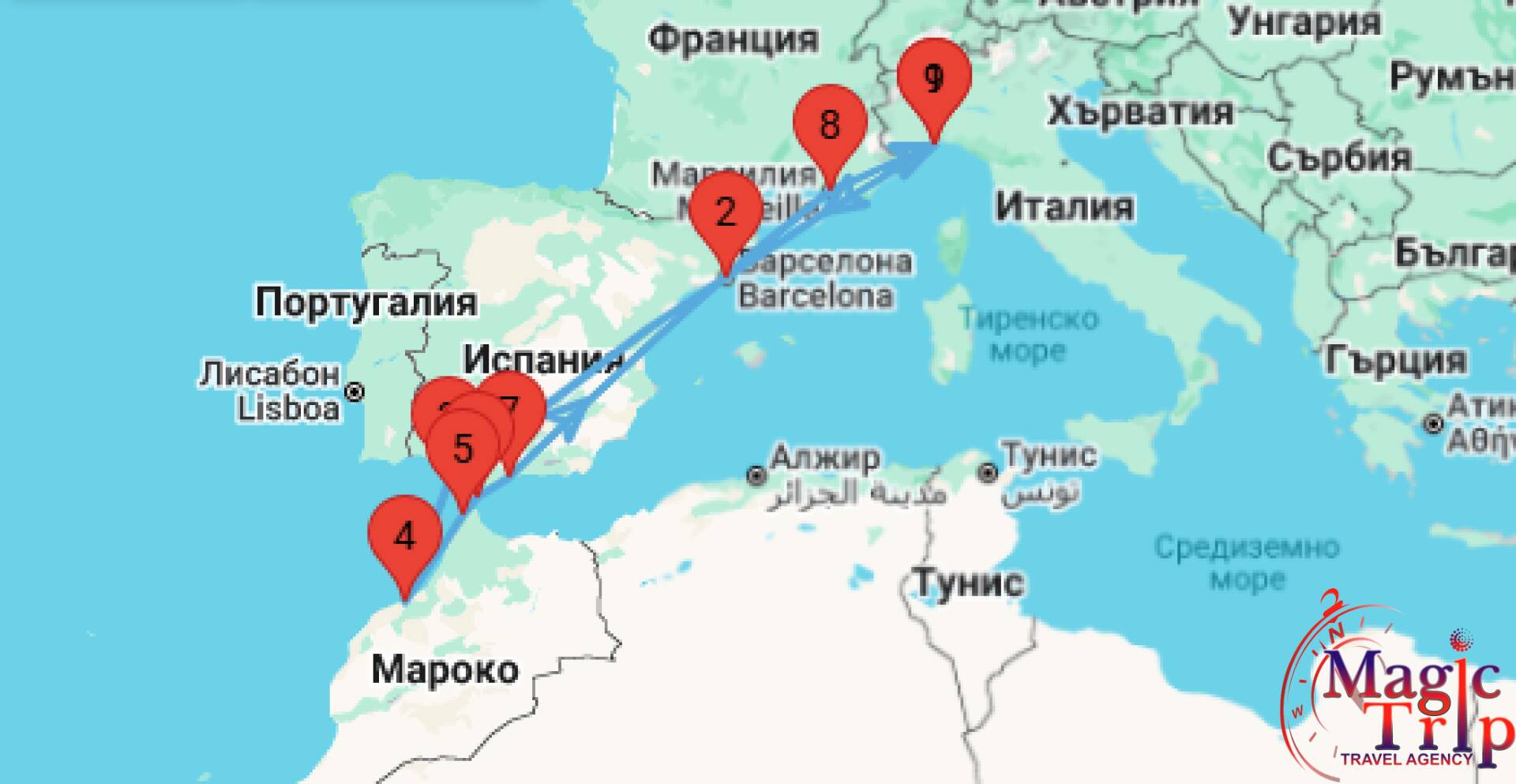 Маршрут на круиза:   Савона – Барселона – В открито море – Кадиз – Казабланка - Танжер - Гибралтар - Малага - В открито море – Марсилия – Савона